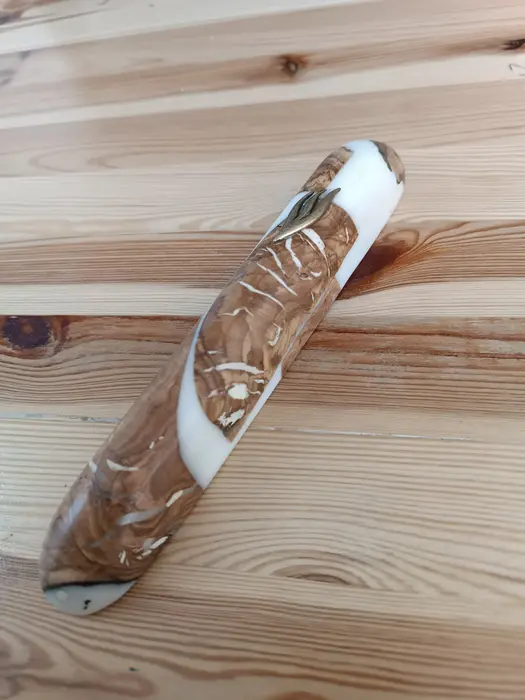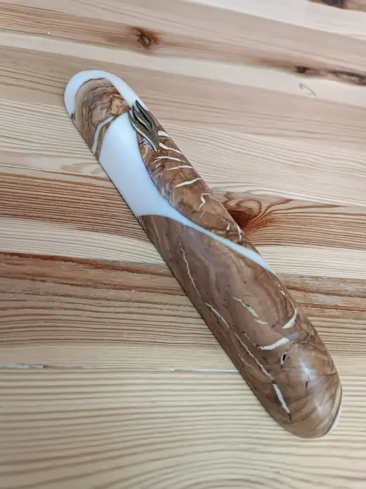 בתוך גופי העץ משתלב אלמנט של שרף אפוקסי בצבע לבן שנהגה ונשפך ביד ליצירת קונטרסט מרתק ועדין במיוחד. האפוקסי מעניק לבית המזוזה מראה מודרני יותר, אך כזה שאינו גונב את ההצגה מהעץ אלא משלים אותו באופן מושלם. השילוב הזה לא רק יפה לעין, אלא גם מוסיף חוזק ועמידות לאורך זמן.