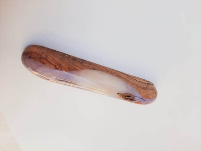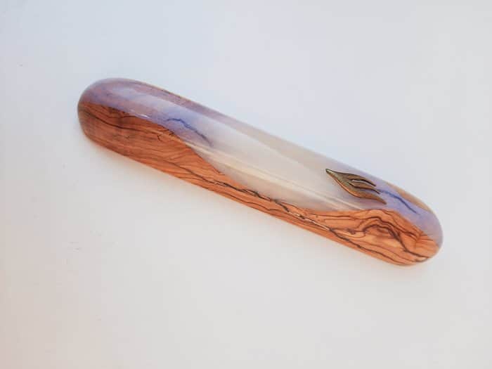 בתוך גופי העץ משתלב אלמנט של שרף אפוקסי בצבע לבן שנהגה ונשפך ביד ליצירת קונטרסט מרתק ועדין במיוחד. האפוקסי מעניק לבית המזוזה מראה מודרני יותר, אך כזה שאינו גונב את ההצגה מהעץ אלא משלים אותו באופן מושלם. השילוב הזה לא רק יפה לעין, אלא גם מוסיף חוזק ועמידות לאורך זמן.