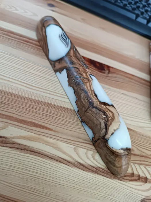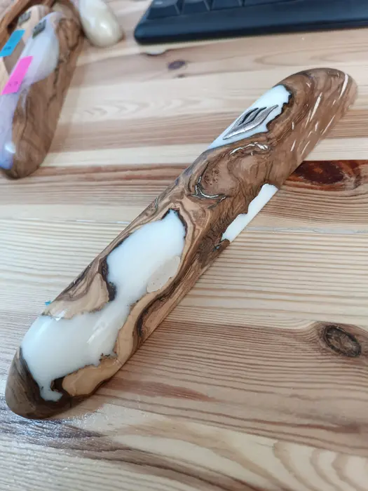 בתוך גופי העץ משתלב אלמנט של שרף אפוקסי בצבע לבן שנהגה ונשפך ביד ליצירת קונטרסט מרתק ועדין במיוחד. האפוקסי מעניק לבית המזוזה מראה מודרני יותר, אך כזה שאינו גונב את ההצגה מהעץ אלא משלים אותו באופן מושלם. השילוב הזה לא רק יפה לעין, אלא גם מוסיף חוזק ועמידות לאורך זמן.